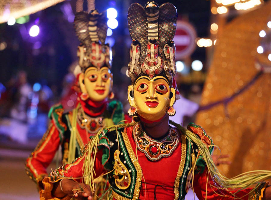 Στην παρέλαση παίρνουν μέρος χιλιάδες χορευτές, που ανεμίζουν πολύχρωμες σημαίες και τυμπανιστές. Στην κορύφωσή της κατά την πανσέληνο παρελαύνουν έως και 50-60 ελέφαντες, με κυρίαρχο τον Μαλιγκάβα Τάσκερ, που μεταφέρει τιμητικά το Ιερό Δόντι. Είναι στολισμένος από το κεφάλι έως τα νύχια και πατά τιμητικά πάνω σε ένα λευκό χαλί, που στρώνεται μπροστά του.