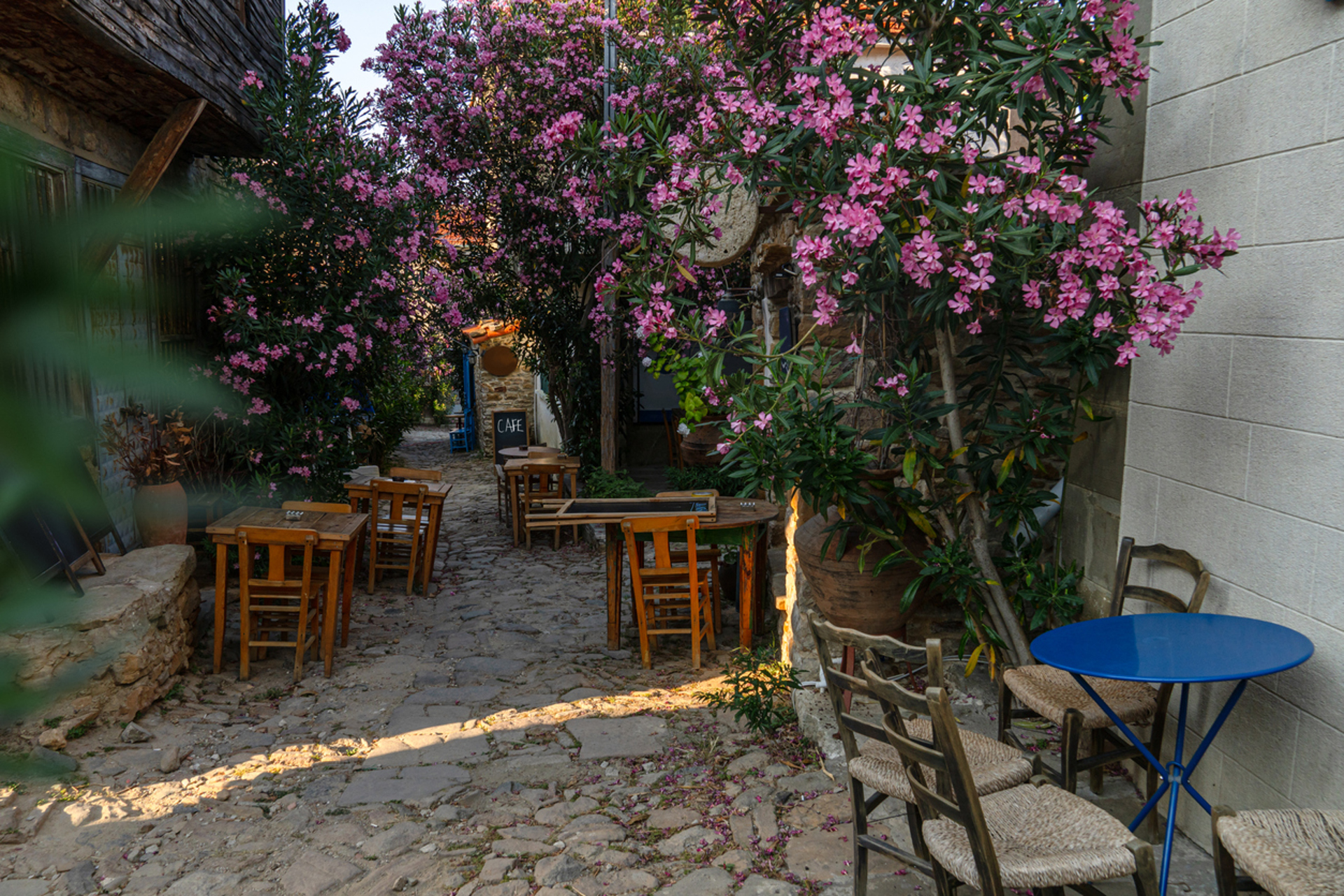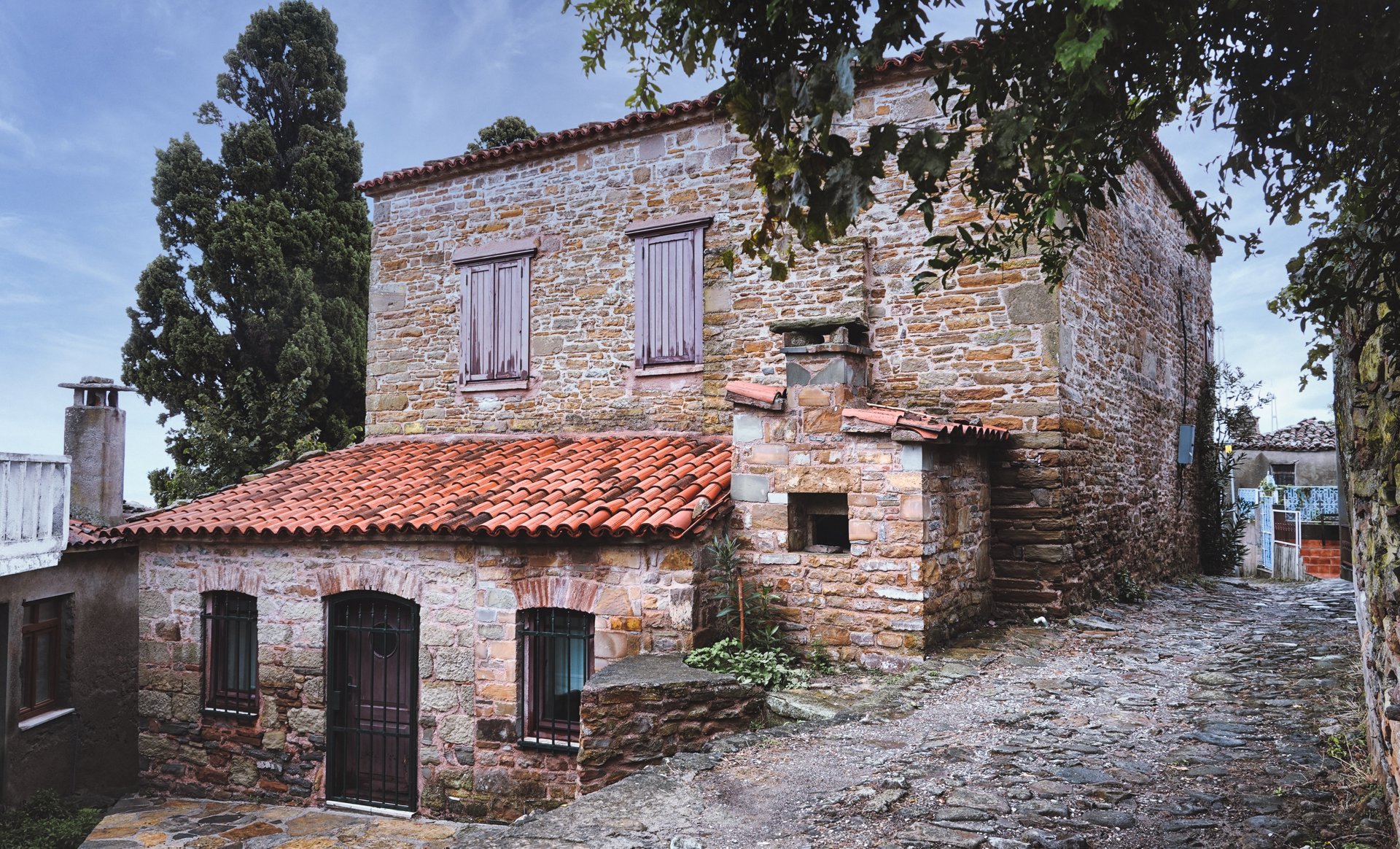 Τα σπίτια, κατασκευασμένα από πέτρα, λάσπη, ξύλο και κεραμίδι, έχουν σοφά αξιοποιήσει τη γεωμορφολογία τους εδάφους, αναδεικνύοντας λειτουργικά στοιχεία της παραδοσιακής αρχιτεκτονικής του βορειοανατολικού Αιγαίου.