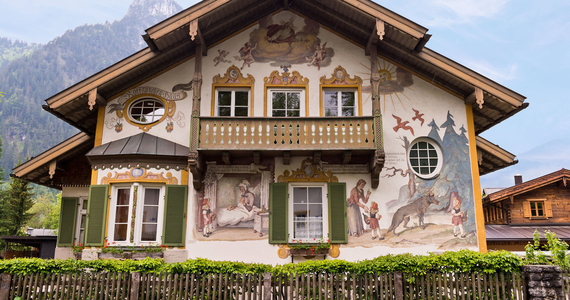 Το Ομπεραμεργκάου είναι ένα παραμυθένιο χωριό στους πρόποδες των Άλπεων, διάσημο για τα υπέροχα ζωγραφισμένα από ντόπιους σπίτια του και την αναπαράσταση των Παθών του Χριστού κάθε 10 χρόνια. Περπατώντας θα τα δούμε όλα από κοντά: στους τοίχους ολόγυρα υπάρχουν θέματα θρησκευτικού περιεχομένου, δοσμένα με ρομαντικό τρόπο, βουκολικές αναπαραστάσεις από τη ζωή της υπαίθρου, την καθημερινότητα και κυρίως εικόνες από τον ονειρικό κόσμο των παραμυθιών και του γερμανικού θρύλου.