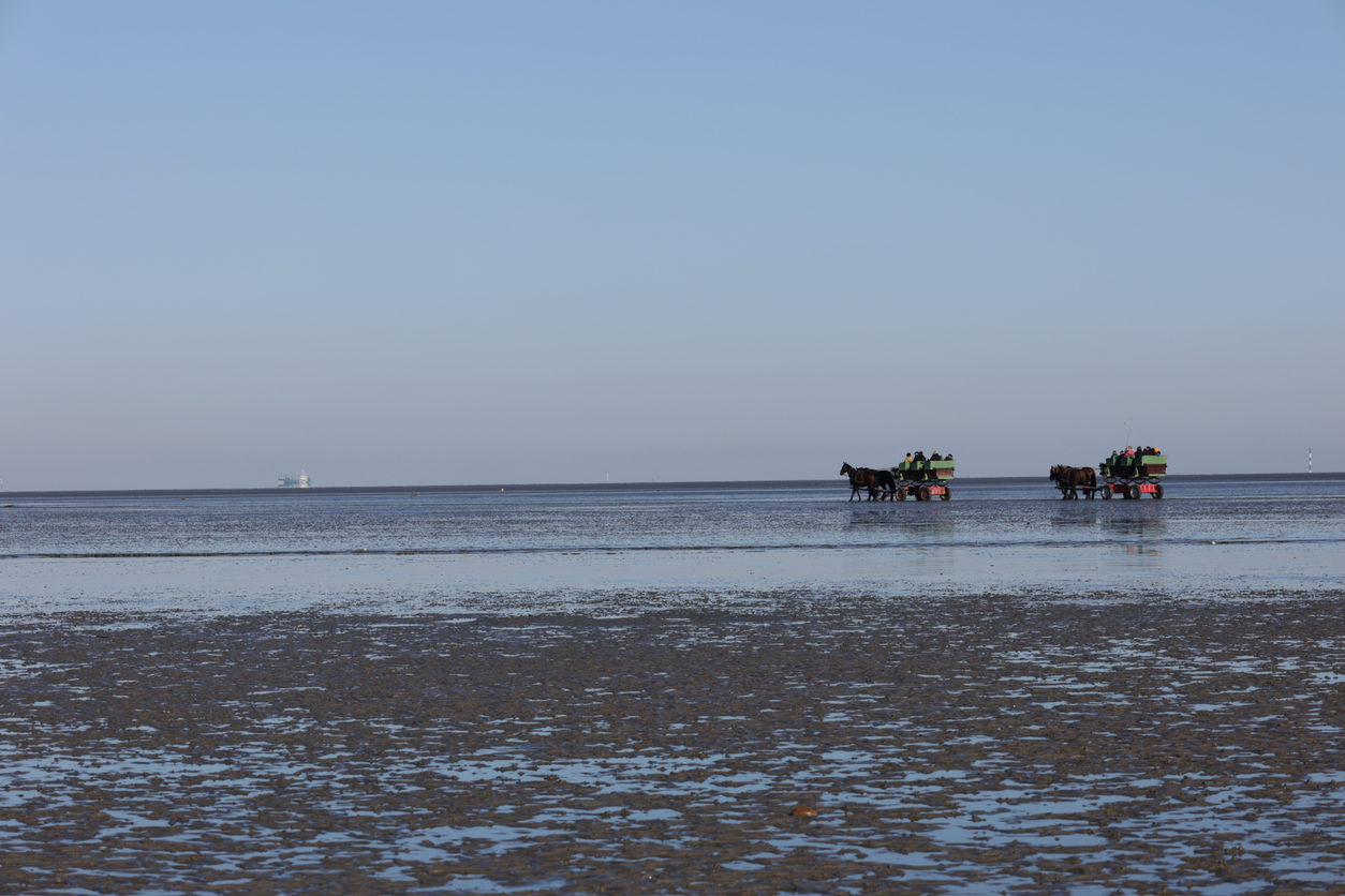 Καιρού επιτρέποντος και με ωράριο ανάλογο της παλίρροιας, θα διασχίσουμε τον βυθό της θάλασσας με ειδικές άμαξες την ώρα της άμπωτης, αφού θα έχουν αποτραβηχτεί τα ύδατα. Μας περιμένει ένα ιδιαίτερο περιβάλλον και ένας παράξενος βιότοπος. Οι άμαξες θα μας φέρουν μέχρι το νησάκι Νόιβερκ, από το οποία θα επιστρέψουμε πάλι με άμαξες ή αν δεν το επιτρέπει η πλημμυρίδα εν πλω...